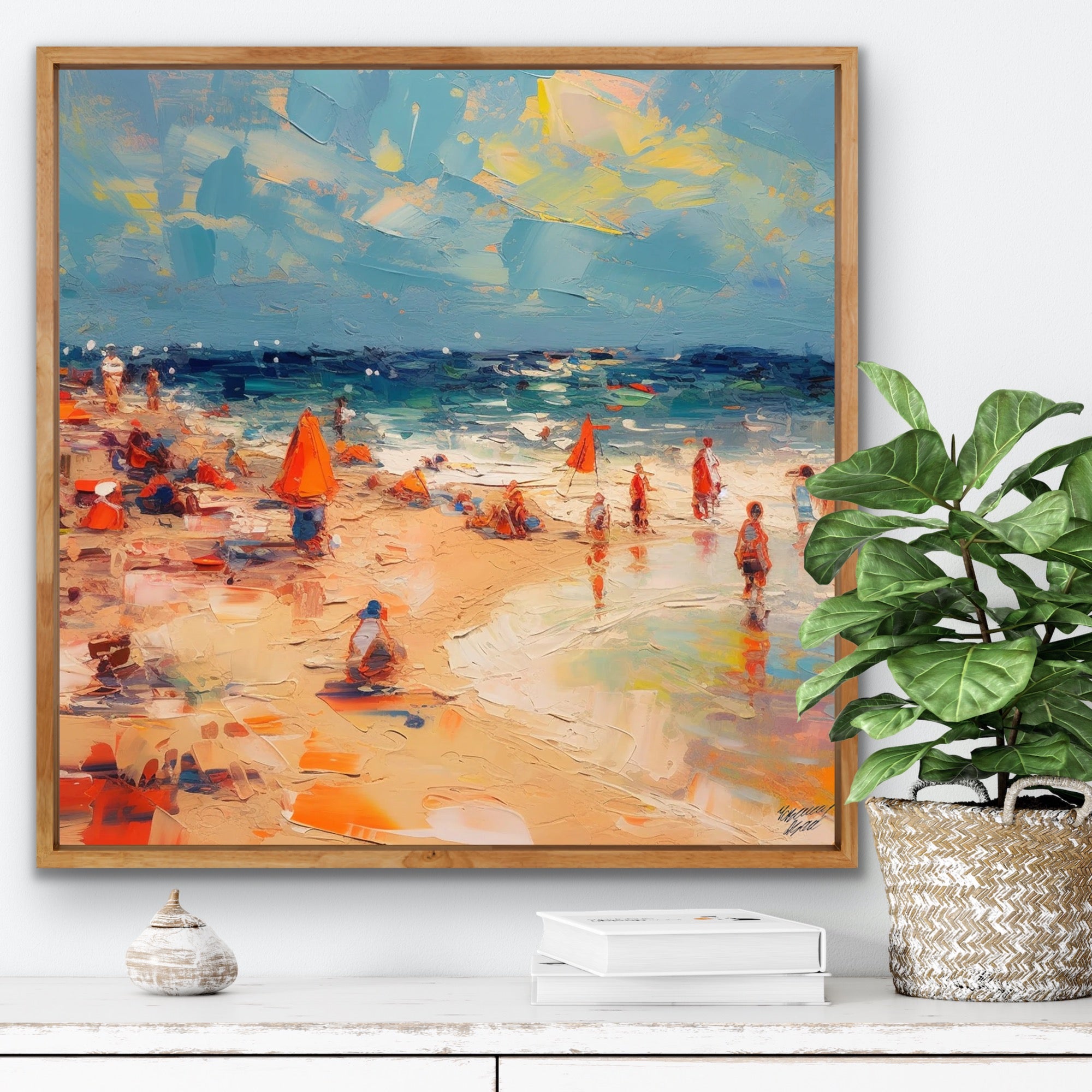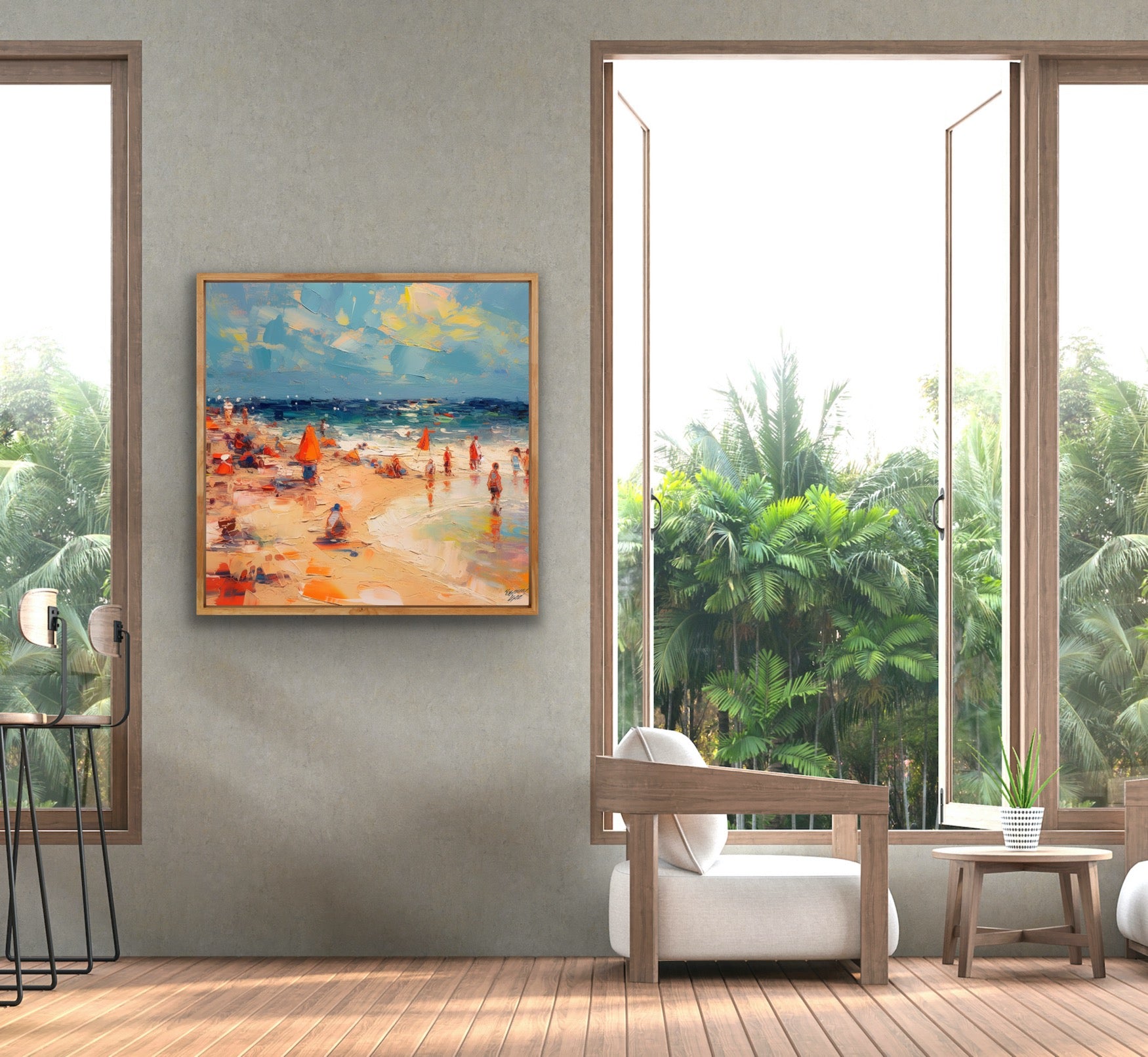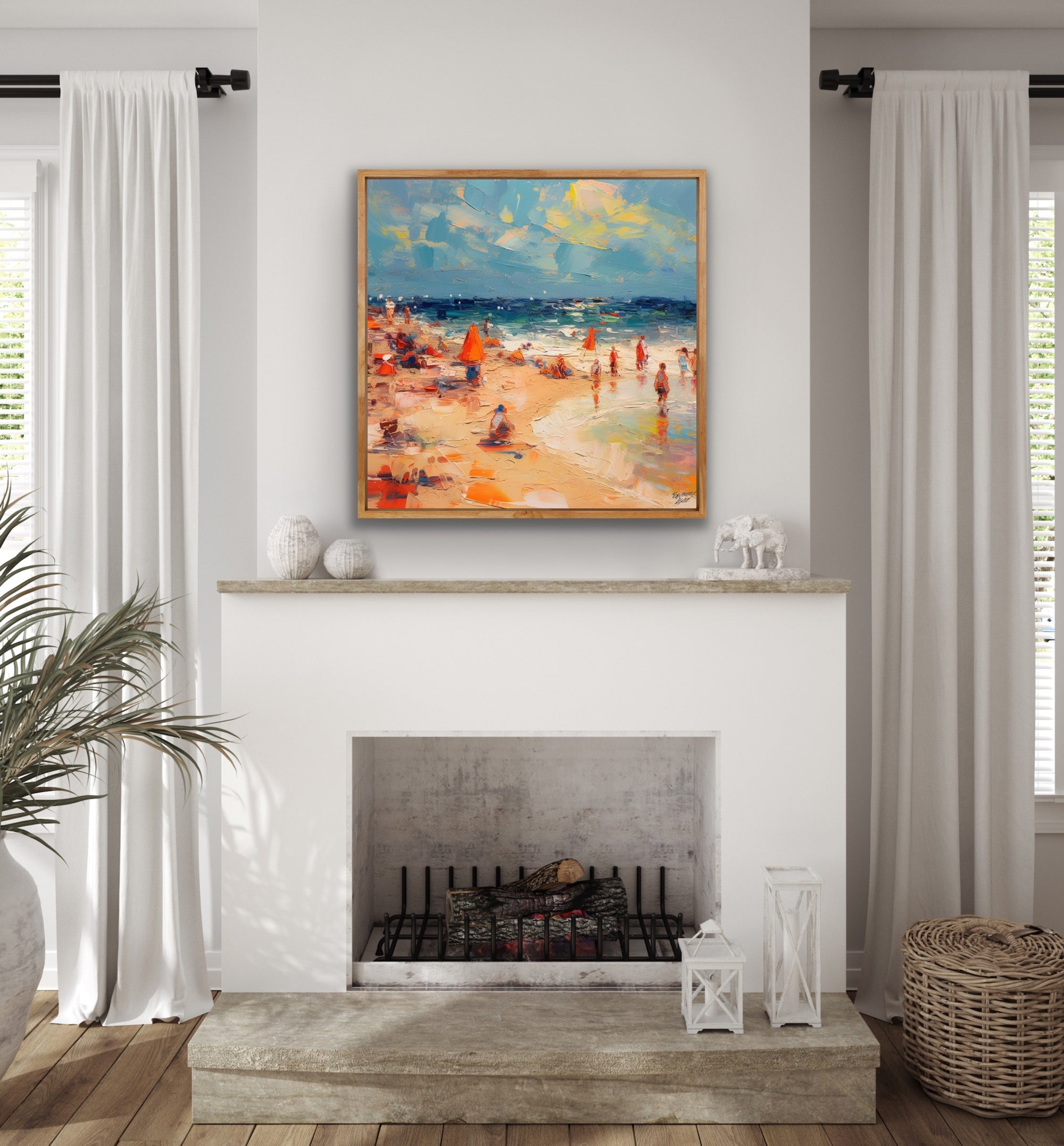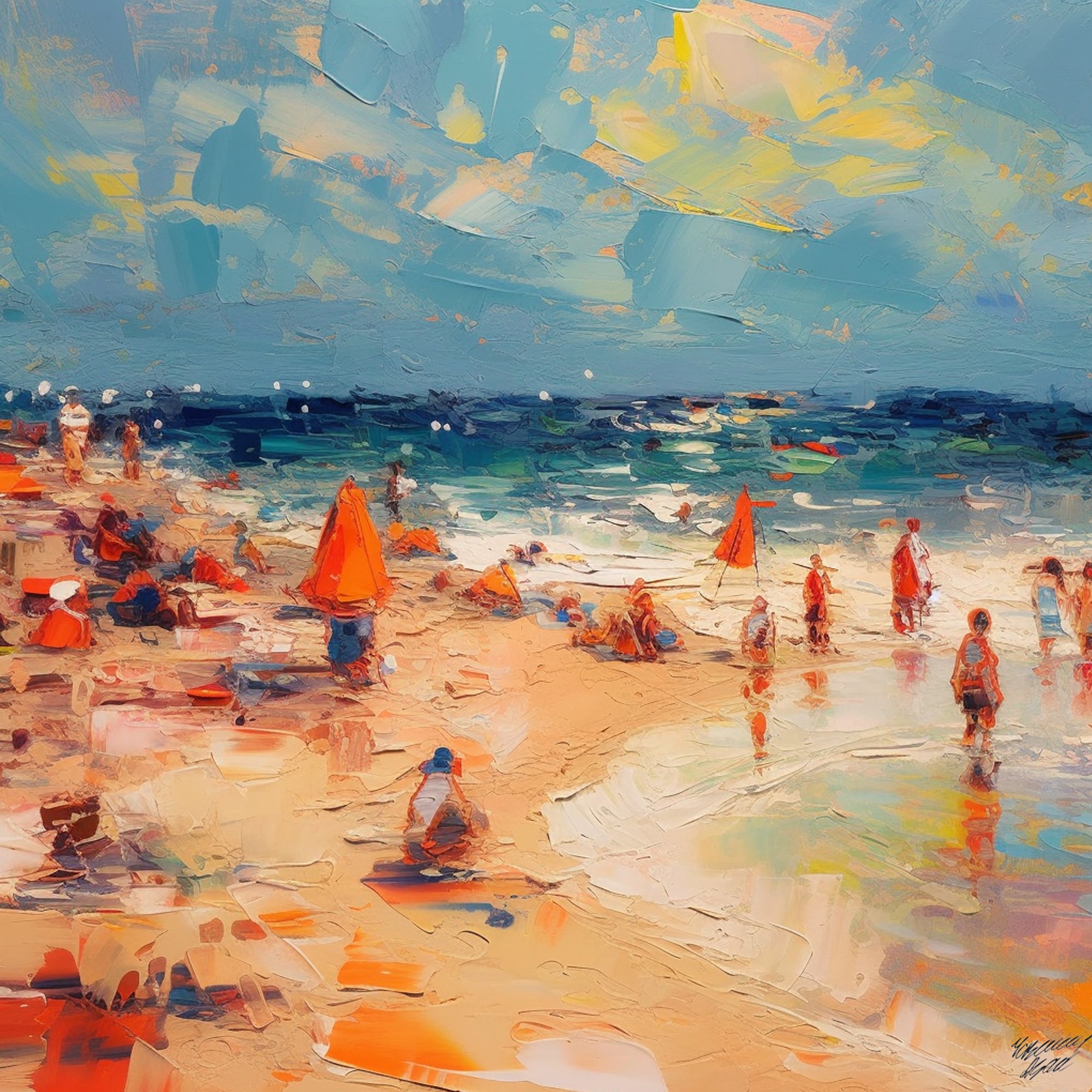 Summer at the Beach is an oil painting featuring a sun-drenched beach scene. The painting captures the bright hues of the sand, sea, and sky and the relaxed atmosphere of a summer day on the beach. The painting conveys a sense of warmth, relaxation, and the joy of a perfect day at the beach.